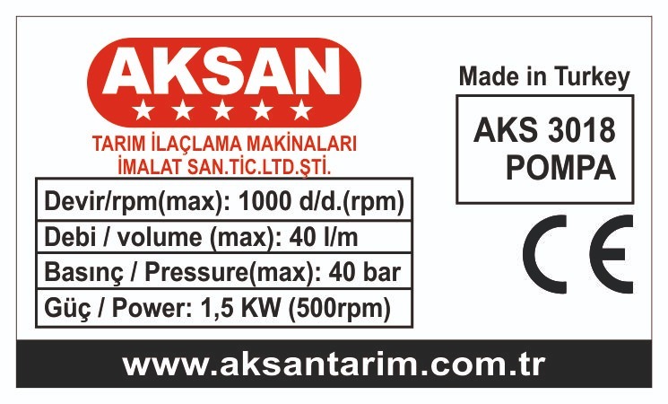- Aksan 3018 40 Bar İlaçlama Pompası Ünitesi model bahçe ilaçlamak için kullanılan tarımsal ilaçlama pompasıdır.